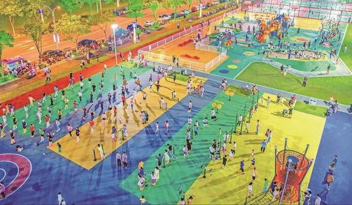 公園亮化提檔升級,點點燈光宛如璀璨星河,點亮了人們的夜間生活?!霸诩依锟照{房間待久了不舒服,來公園吹吹自然風,看看美麗的夜景,不失為一種享受?!迸惆槟赣H在這里散步的市民陳女士說,與公園外的車水馬龍、城市喧囂相比,公園里寧靜的氣息讓人倍感愜意。