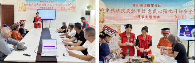 9月13日,泗洪縣青陽街道戚莊社區開展 “迎中秋共筑民族團結 惠民心強化網絡安全”中秋節主題活動。志愿者向各族群眾普及網絡安全法律法規知識,倡導安全上網、綠色上網、文明上網。接著,居民們提筆接龍中國經典古詩句,從詩詞中感受濃厚的節日氣氛。最后,大家共同制作月餅,感受大家庭的溫暖。