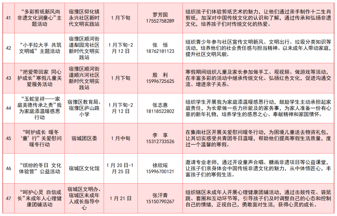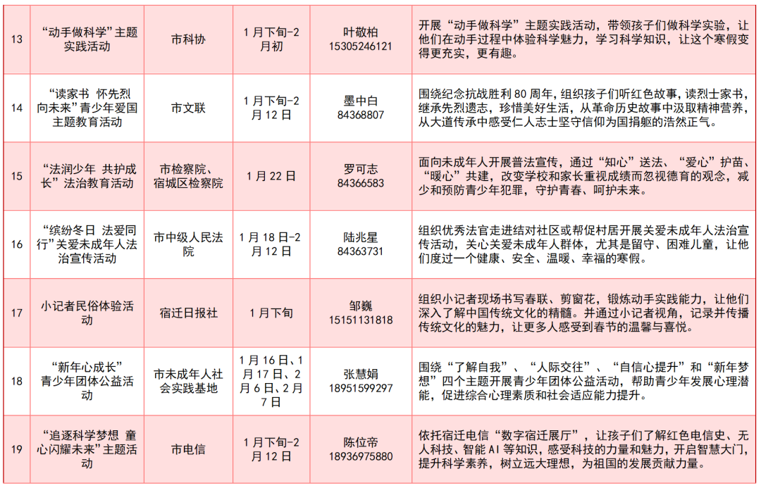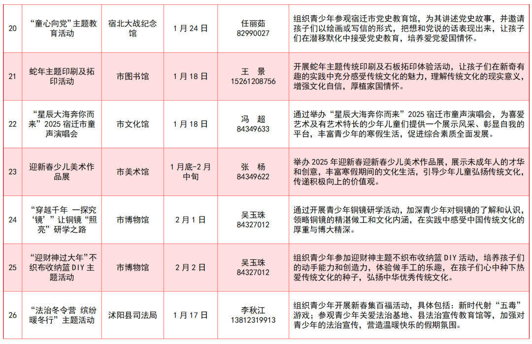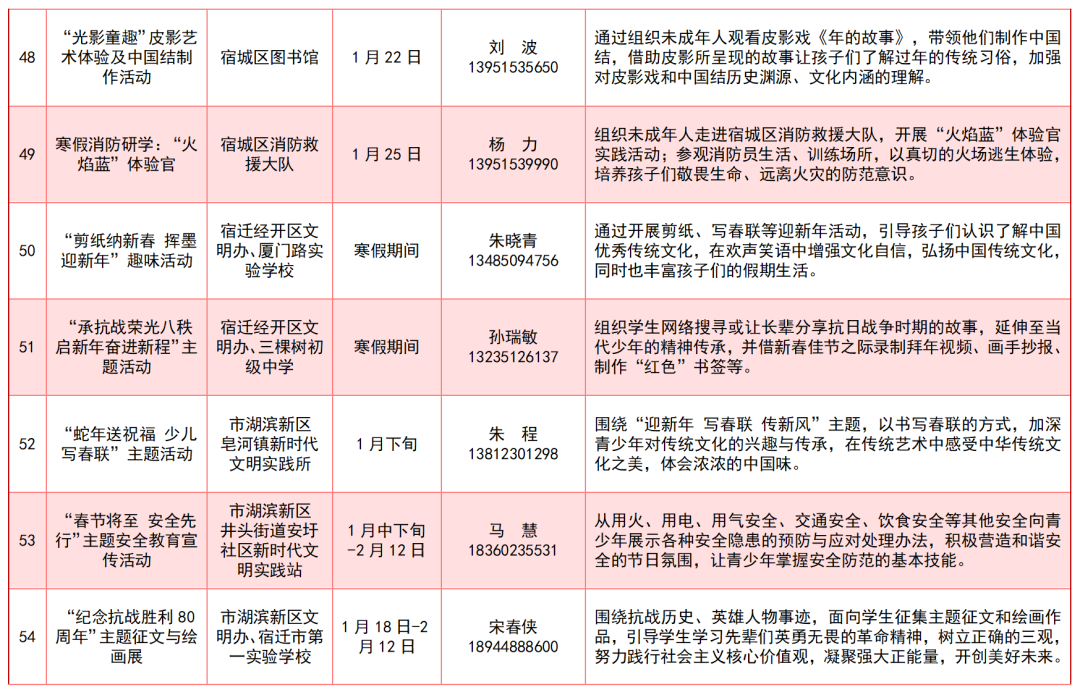 為進一步豐富未成年人寒假生活,讓孩子們共度文明健康、充實愉快的假期,宿遷市各地圍繞紀念抗戰勝利80周年,精心設計紅色傳承、傳統文化、主題教育、美育活動、文明禮儀、心理健康、勞動教育、關愛幫扶、志愿服務、科技普及等活動項目,開展2025年宿遷市“繽紛的冬日”未成年人寒假系列活動重點項目60項。寒假即將來臨,趕快來報名參加這些繽紛多彩的寒假活動吧!