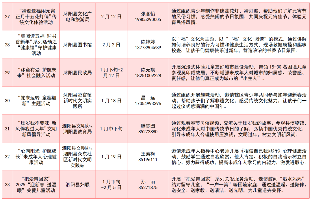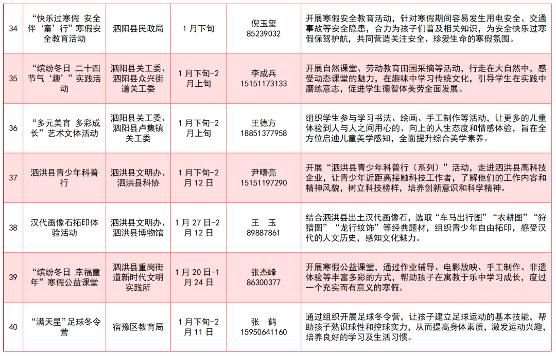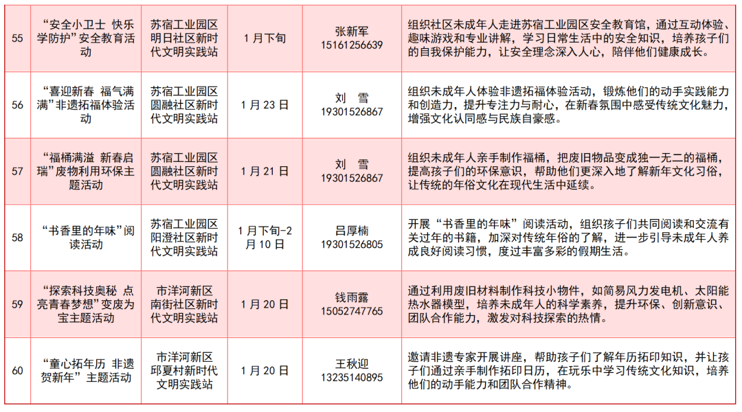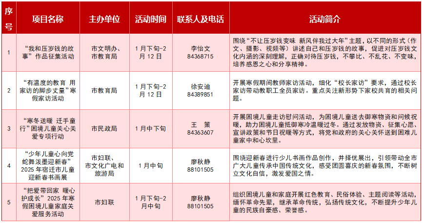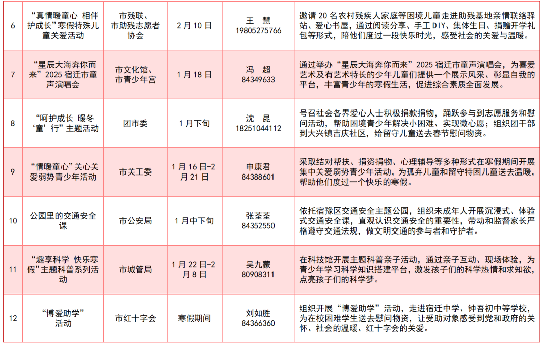 為進一步豐富未成年人寒假生活,讓孩子們共度文明健康、充實愉快的假期,宿遷市各地圍繞紀念抗戰勝利80周年,精心設計紅色傳承、傳統文化、主題教育、美育活動、文明禮儀、心理健康、勞動教育、關愛幫扶、志愿服務、科技普及等活動項目,開展2025年宿遷市“繽紛的冬日”未成年人寒假系列活動重點項目60項。寒假即將來臨,趕快來報名參加這些繽紛多彩的寒假活動吧!