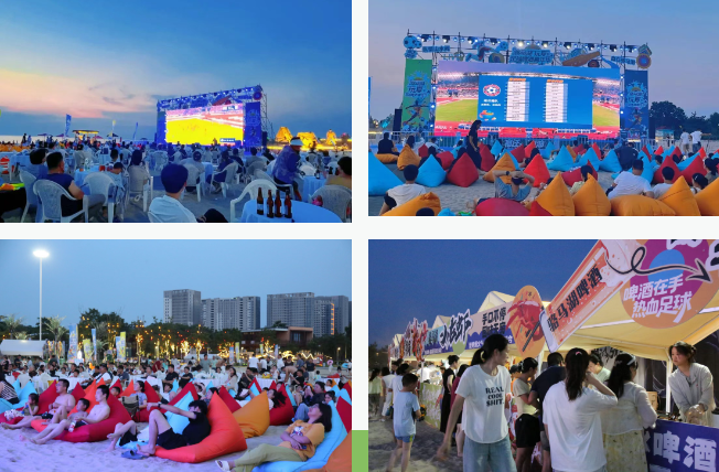 湖濱新區在駱馬湖沙灘公園搭設巨幅屏幕,設置美食、文創集市攤點。百余名球迷、游客圍坐觀看賽事直播,賽況扣人心弦、球迷屏氣凝神,湖風熱浪與吶喊聲浪此起彼伏,球迷的澎湃激情傳遍駱馬湖畔的每個角落。