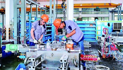 寧波臻至機(jī)械模具有限公司的車間內(nèi),兩名工人正在組裝模具。資料圖片