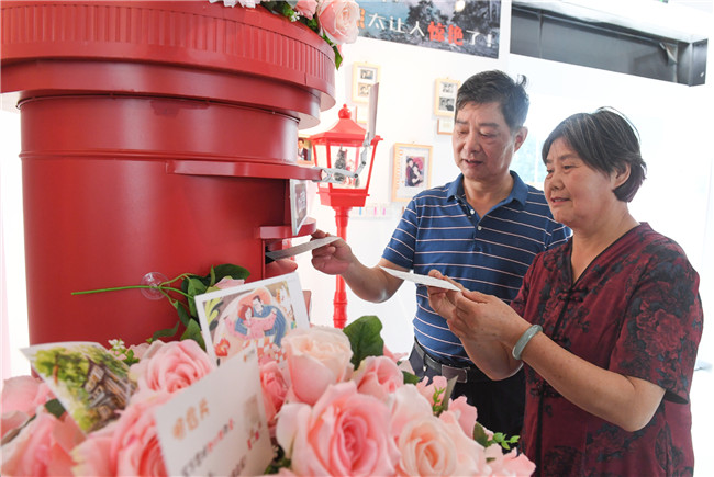 金婚老人寫下對(duì)另一半平時(shí)羞于表達(dá)的甜蜜情話,投遞到由南京愛(ài)情博物館、中國(guó)郵政江蘇分公司、花鄰打造“愛(ài)情郵筒”專屬網(wǎng)紅郵筒 本報(bào)記者 余萍攝