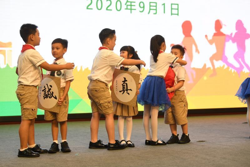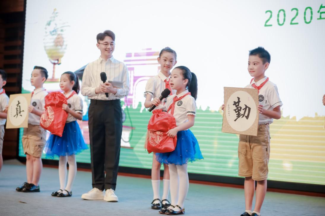 在金中河西的校園里,有很多多才多藝的小精靈們,他們在德智體美勞各個方面全面發展,活動現場,學校“出彩小精靈”代表給一年級新生送上了寓意學校“誠真勤仁”校訓的“大福袋”,并為一年級新生代表正衣冠,佩戴“出彩小精靈”徽章。