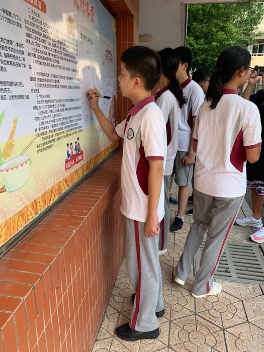 新學(xué)期,北環(huán)中學(xué)首次升旗儀式以“厲行節(jié)約、反對浪費(fèi)”為主題, 八(7)班向全校師生發(fā)起倡議,并組織大家在倡議書上簽名。學(xué)校的“午餐光盤”行動(dòng)從9月1日正式開始,各年級派出“校園觀察員”每天進(jìn)行檢查登記并及時(shí)反饋提醒。
