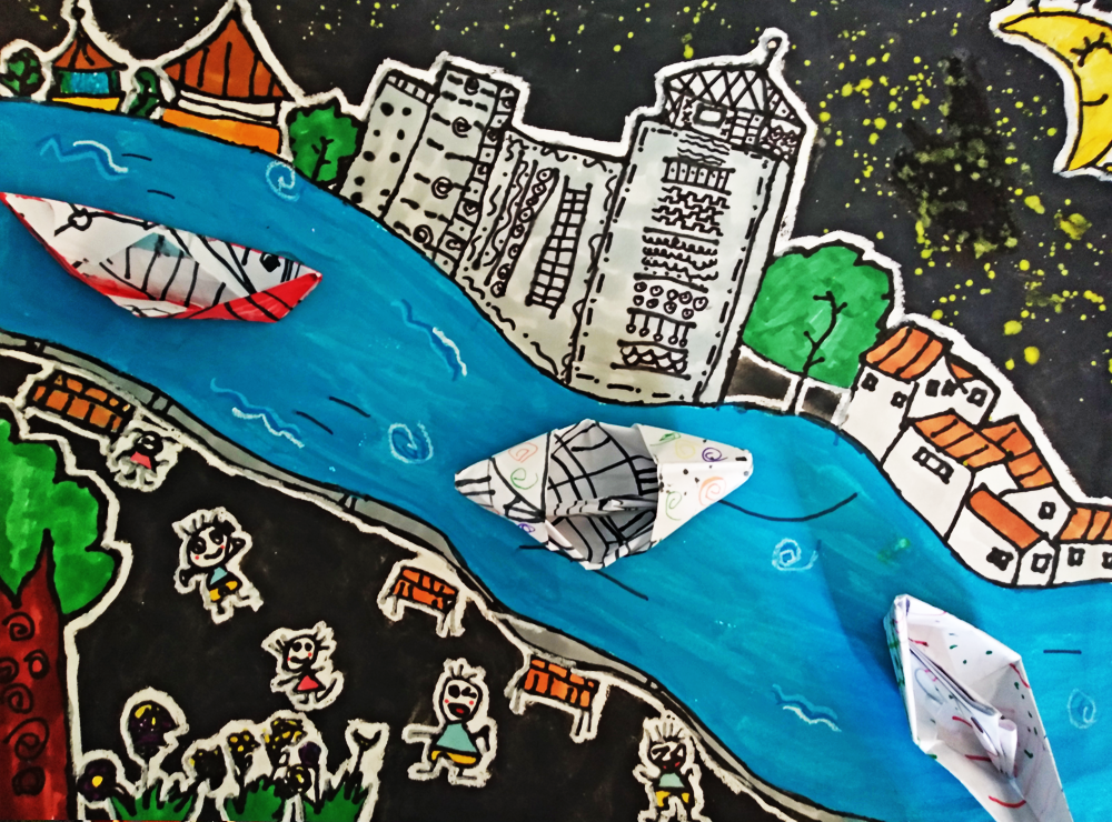 作品介紹:比起景色宜人的運河晨光,運河夜景更加引人入勝。每當夜幕降臨,月亮就會露出笑臉,星星眨著眼睛,一陣微風吹來,水面蕩起層層波紋,運河閃閃發(fā)光。小朋友們來到運河河畔,有的欣賞著對岸的風景,有的討論著來往的游船,還有的伴隨著音樂跳起了舞。整個運河邊都回蕩著歡聲笑語,洋溢著歡快的氣氛。