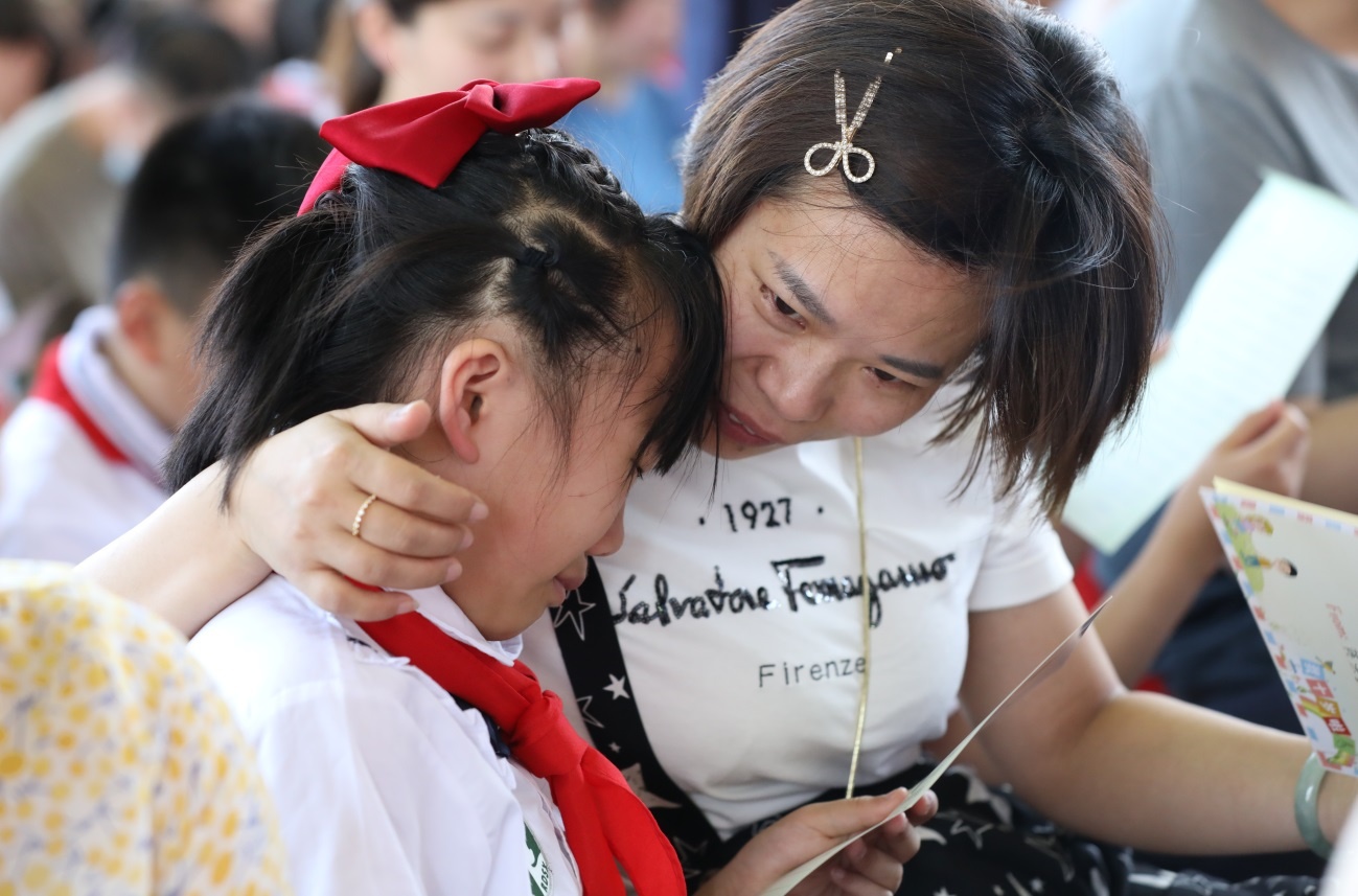 伴隨著音樂,家長給孩子們送上一封飽含深情的信、一份飽藏愛意的禮物,孩子們也將許多心里話寫在信中向家長傾訴。“孩子,希望你在接下來的10年里羽翼漸豐,積蓄搏擊長空的力量。”打開一封封家書靜靜閱讀,許多孩子和家長淚眼婆娑。
