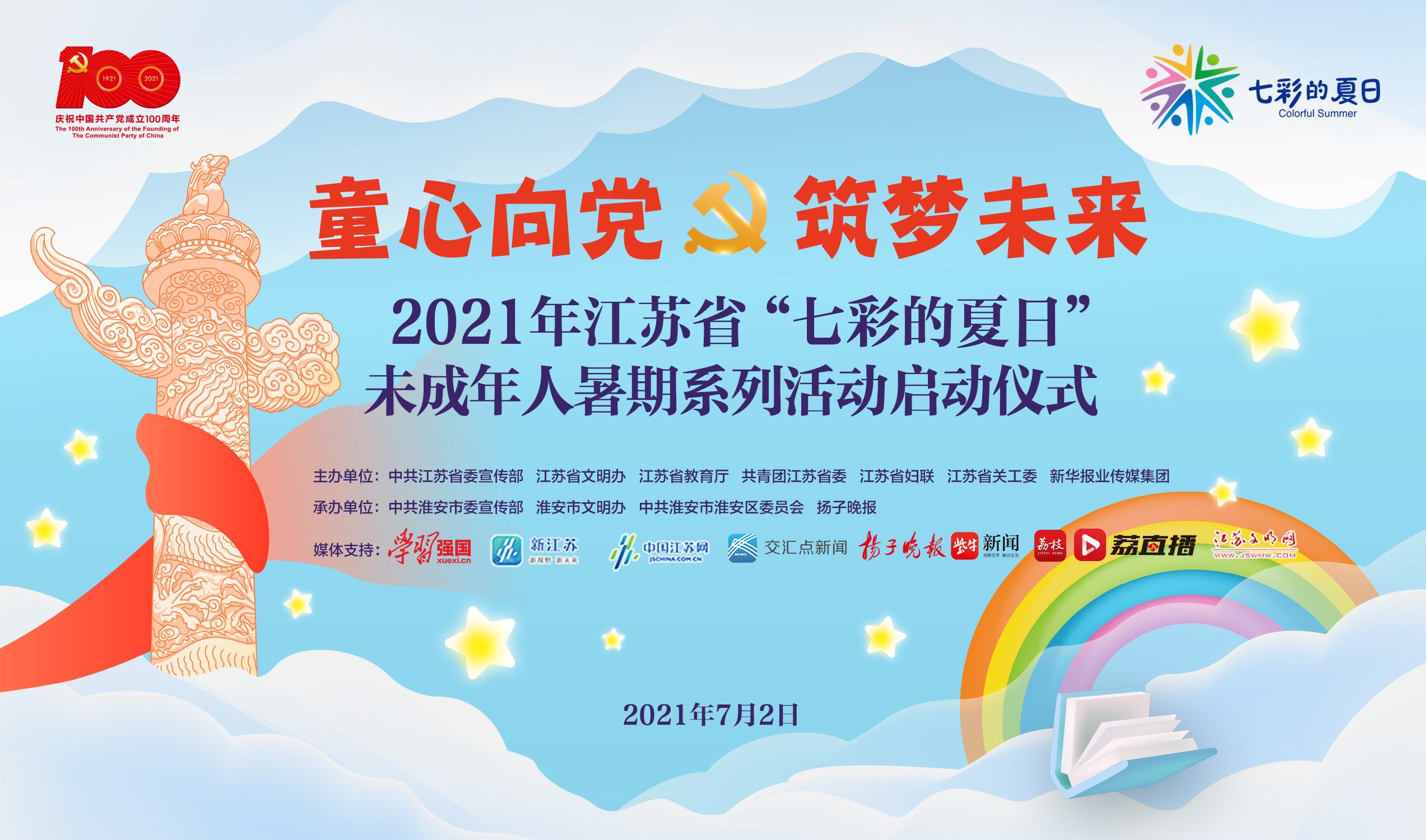 百年奮斗路,童心永向黨。7月2日,在全國上下喜慶中國共產(chǎn)黨成立100周年、深入學(xué)習(xí)習(xí)近平總書記在慶祝中國共產(chǎn)黨成立100周年大會(huì)上的重要講話精神的濃厚氛圍中,由中共江蘇省委宣傳部、省文明辦、省教育廳、團(tuán)省委、省婦聯(lián)、省關(guān)工委、新華報(bào)業(yè)傳媒集團(tuán)共同主辦的2021年江蘇省“七彩的夏日”未成年人暑期系列活動(dòng)啟動(dòng)儀式在淮安市新安小學(xué)舉行。本次活動(dòng)圍繞“童心向黨筑夢未來”主題,結(jié)合慶祝建黨百年,通過一系列精彩紛呈的假期活動(dòng),教育引導(dǎo)廣大未成年人在實(shí)踐中賡續(xù)精神血脈,傳承紅色基因,度過一個(gè)安全、充實(shí)、又有意義的假期。啟動(dòng)儀式在新江蘇·中國江蘇網(wǎng)、江蘇文明網(wǎng)、文明江蘇、紫牛新聞客戶端、揚(yáng)子晚報(bào)一直播、荔直播等平臺(tái)同步直播,截至發(fā)稿前,直播總觀看量達(dá)到近500萬人次。