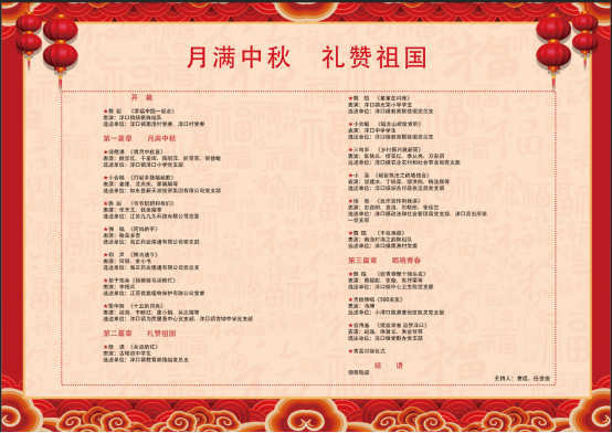 為進一步弘揚中華優秀傳統文化,踐行新時代文明實踐精神,豐富鎮區廣大干群的精神文化生活,將文明城市長效管理、中華傳統美德和文化知識宣傳到每位觀眾的心中。9月18日下午,洋口鎮(沿海經濟開發區)、小洋口旅游度假區機關黨委舉辦“慶中秋 迎國慶”文藝展演。節目由鎮區機關各局辦、村居、企業、教育、衛生等多個黨支部選送,精彩呈現了舞蹈、詩朗誦、合唱、三句半、相聲、小品、音詩畫等節目。