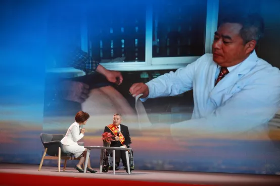有一種奉獻(xiàn),叫堅(jiān)守;有一種敬業(yè),叫執(zhí)著?,F(xiàn)場(chǎng)的大屏幕上,定格著一張照片——兩個(gè)匆匆的背影,手上拿著面包,其中一位就是“抗疫英雄”邱海波。