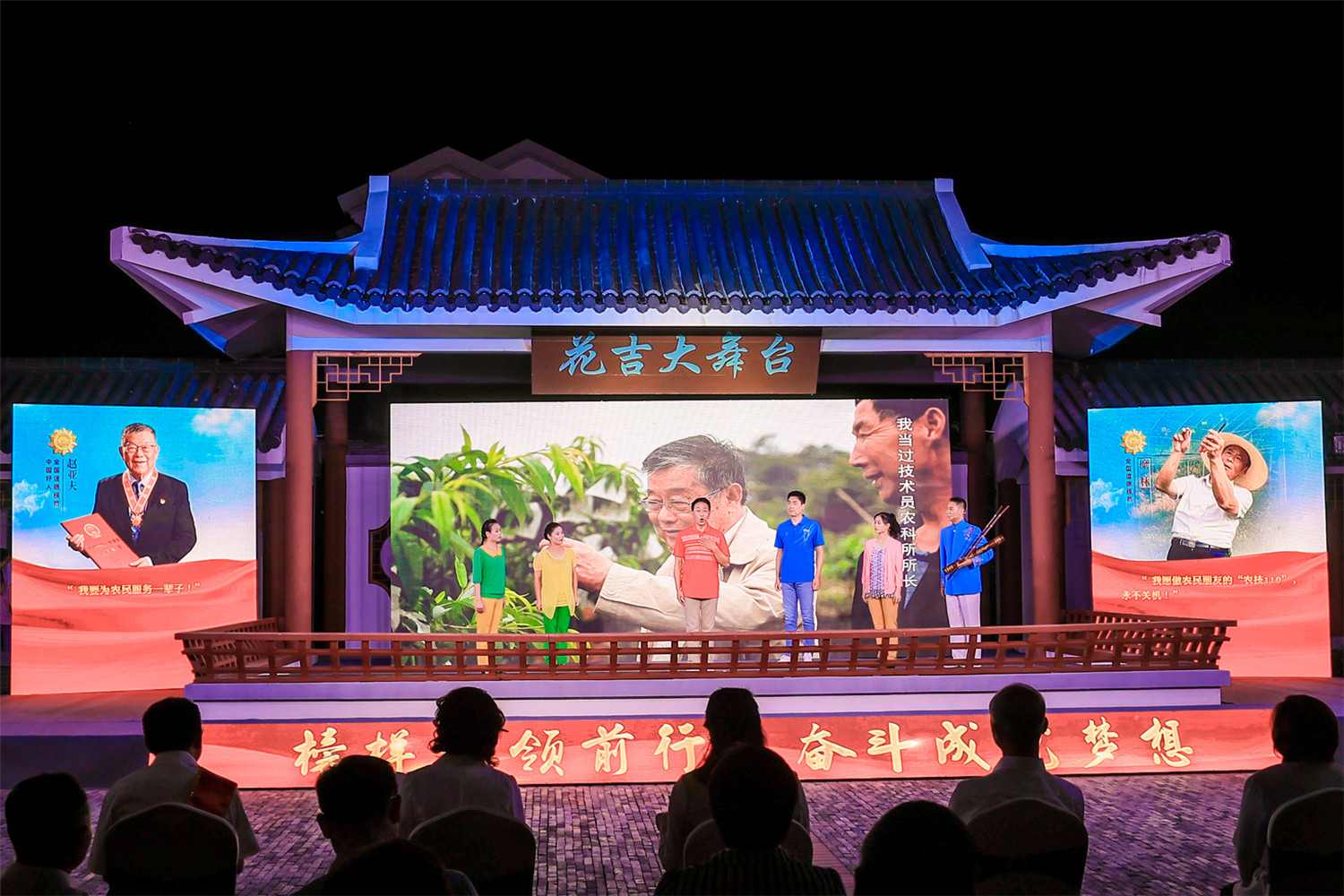 “趙老,我們農(nóng)民謝謝您!糜主任,我們農(nóng)民不忘您!”舞臺(tái)上,表演者手捧著金燦燦的水稻、紅艷艷的草莓以及各種豐收的農(nóng)產(chǎn)品,深情講述了全國(guó)道德模范趙亞夫和糜林的感人事跡。他們?cè)r(nóng)業(yè)一線,把成績(jī)寫(xiě)在大地上,把成果留在農(nóng)民家。“他們說(shuō),再貧瘠的土地也能種出夢(mèng)想、種出太陽(yáng)!”清曲說(shuō)唱《土地情深》深情贊頌了這對(duì)師徒為農(nóng)民服務(wù)一輩子的高尚品質(zhì)。