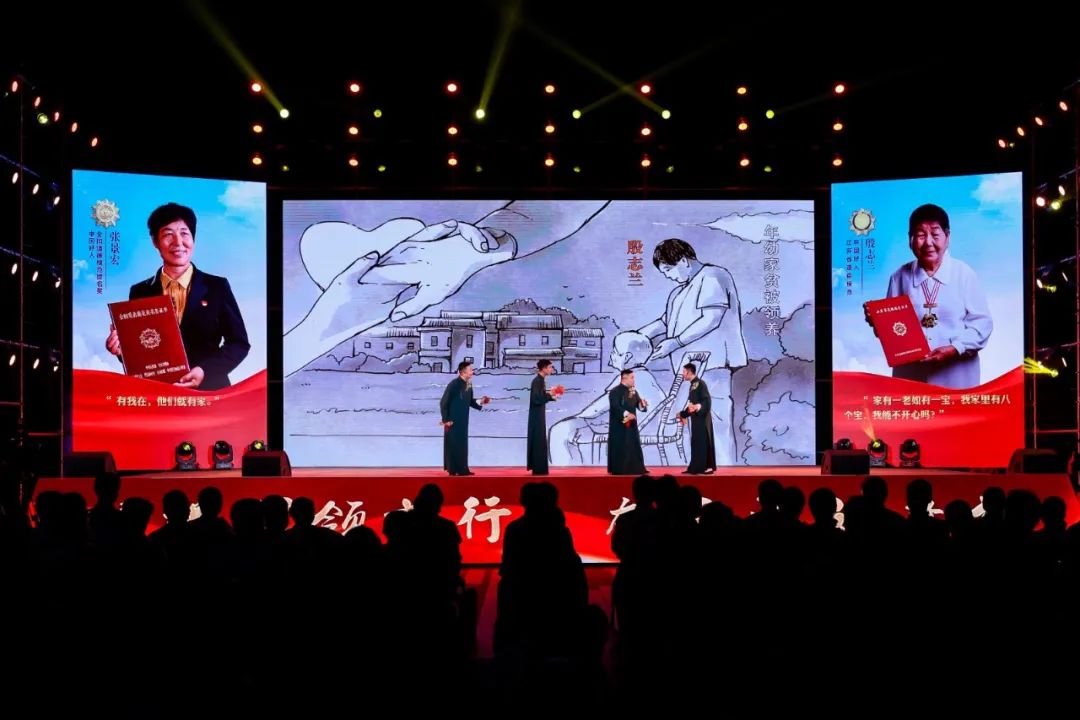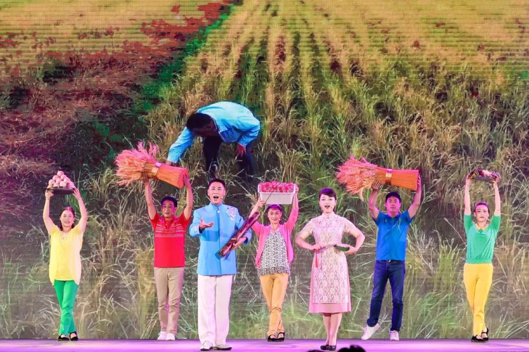 整場活動在清曲說唱《土地情深》中迎來高潮。“趙老,我們農民謝謝您!糜主任,我們農民不忘您!”舞臺上,表演者手捧著金燦燦的水稻、紅艷艷的草莓以及各種豐收的農產品,深情講述了全國道德模范趙亞夫和糜林的感人事跡。他們扎根農業一線,把成績寫在大地上,把成果留在農民家。“再貧瘠的土地也能種出夢想、種出太陽!”深情贊頌了這對師徒為農民服務一輩子的高尚品質。