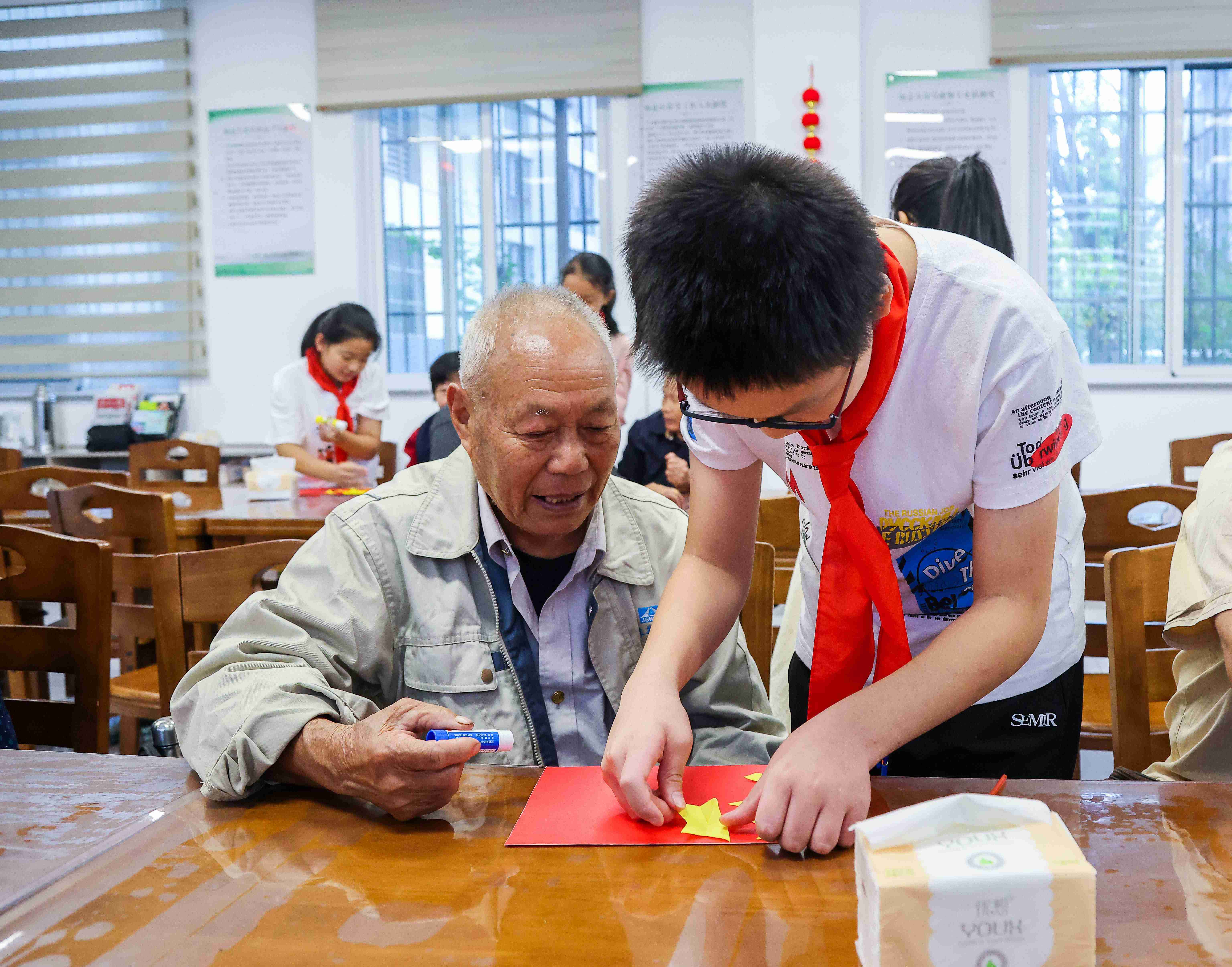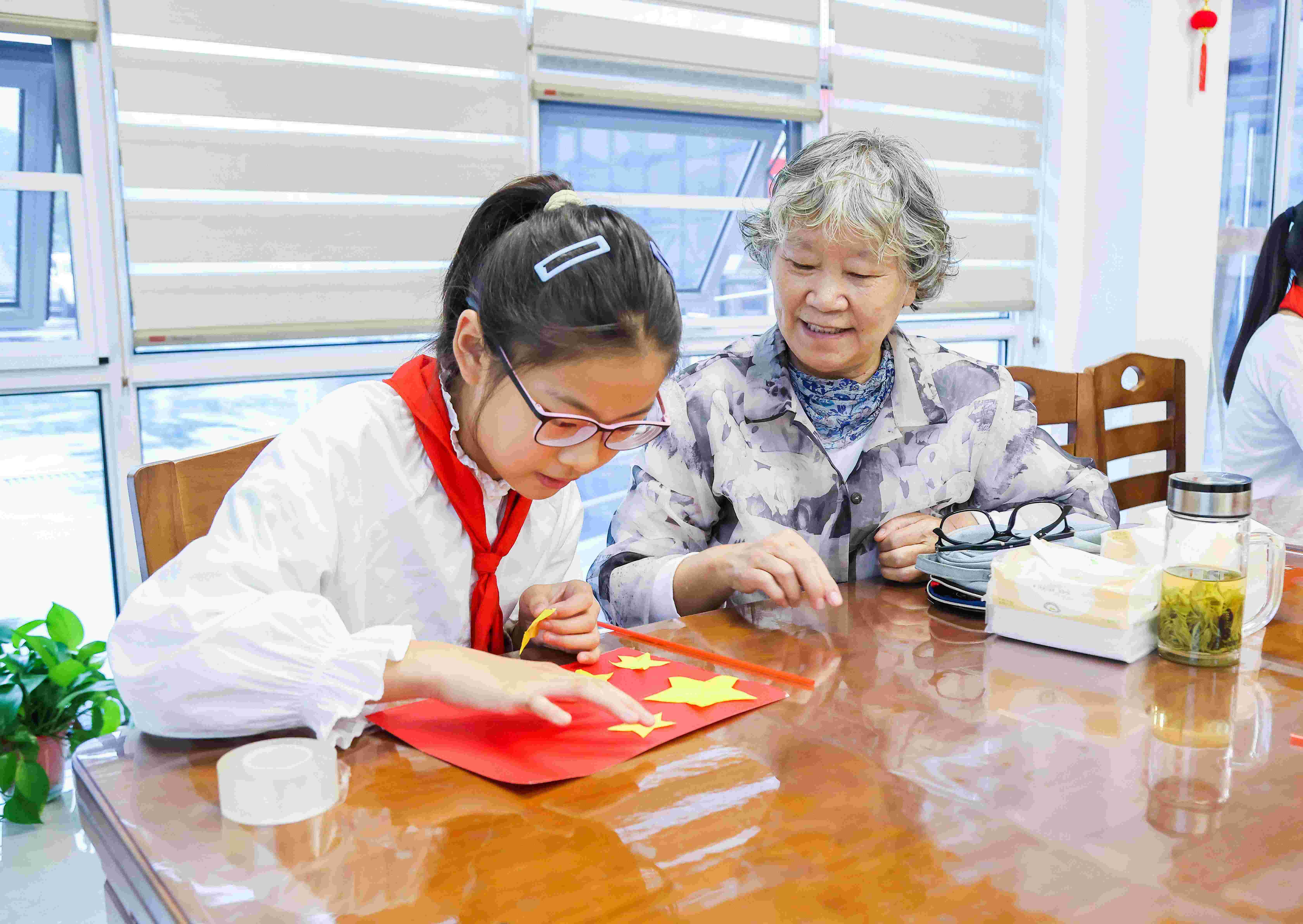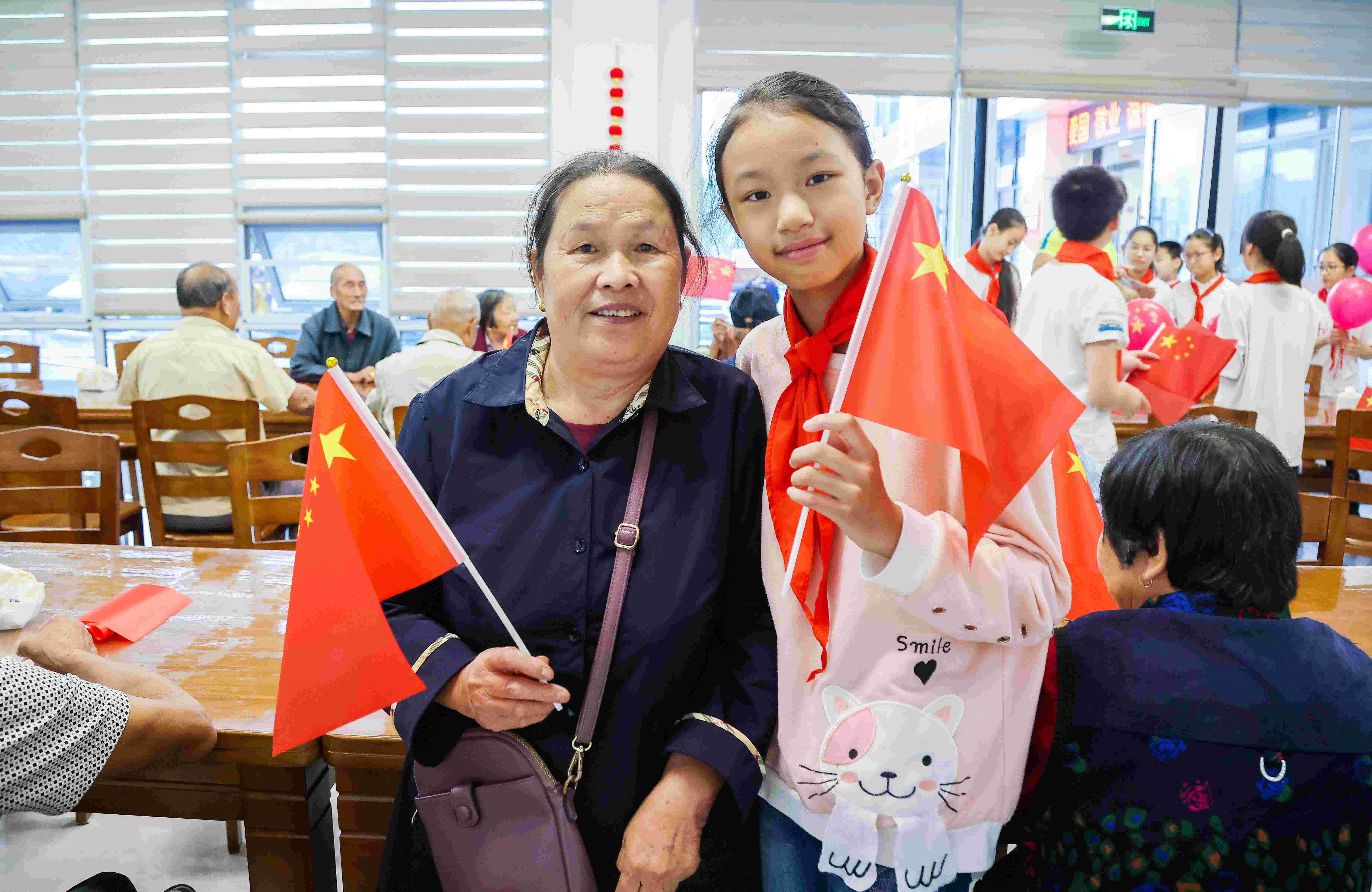 孩子們為老人貼上國旗徽章,并和老人們一起手工制作鮮艷的五星紅旗。在動手實踐中,鶴發與童顏相映成趣。孩子們手里揮舞著五星氣球,和揮舞著小國旗的爺爺奶奶一起唱響《我和我的祖國》。熟悉的旋律中,靜靜流淌著火熱的愛國心報國志。