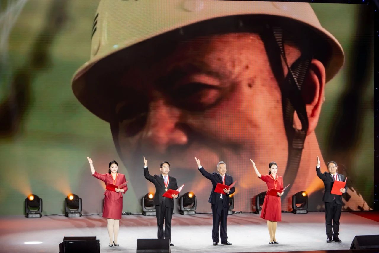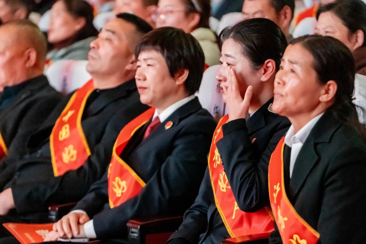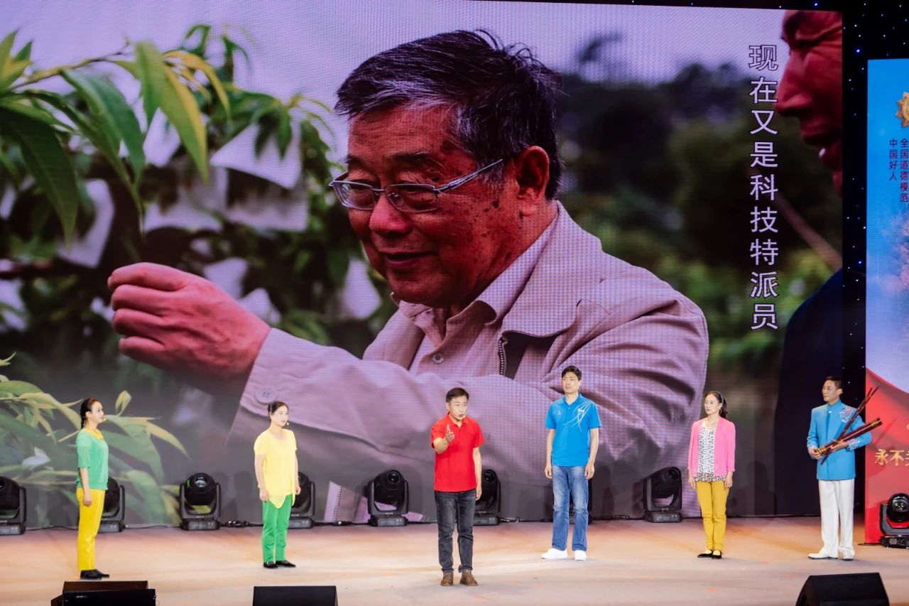 演出開始前,“中國好人”秦民、張豐林、尚慶功、李桂華等當?shù)叵冗M典型代表在觀眾們的熱烈掌聲中步入現(xiàn)場,少先隊員代表們上前為他們獻上了鮮花。