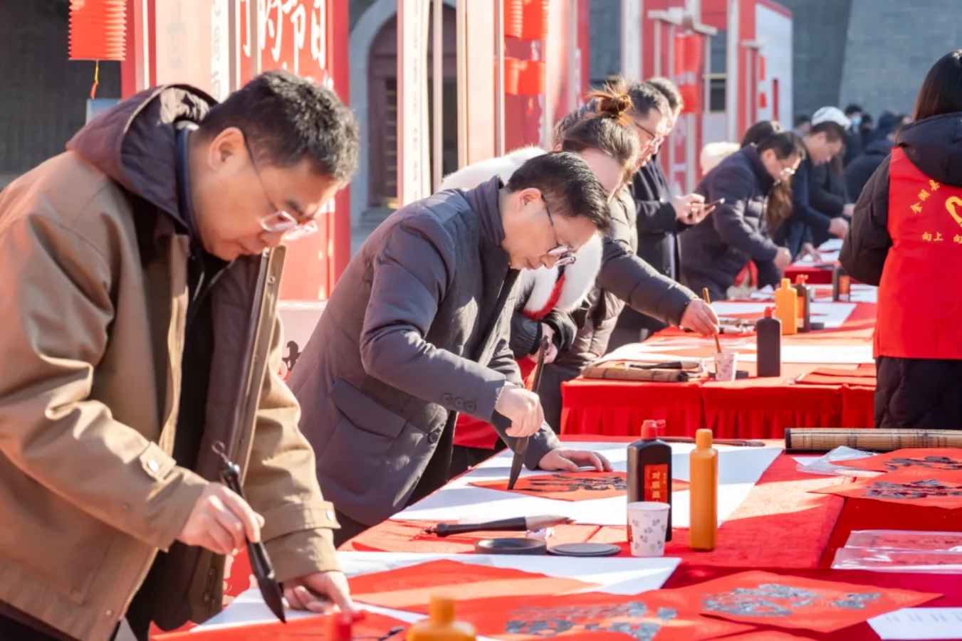 “靈蛇起舞迎新紀(jì),福蛇繞柱迎春到?!薄敖鹕攉I(xiàn)瑞風(fēng)調(diào)雨順繁榮昌盛,玉燕迎春國泰民安幸福祥和?!薄哌M(jìn)活動(dòng)現(xiàn)場,入目便是一幅寫春聯(lián)、送福字的熱鬧景象。來自省市縣的15名書法家和書法愛好者正現(xiàn)場為百姓書寫春聯(lián),鋪開紅紙、揮毫潑墨,一幅幅“蘸”滿祝福的春聯(lián)隨筆尖流動(dòng)而出,一張張紅紅火火的“?!弊周S然眼前,飄逸的對聯(lián)化作最真摯的新春祝福,引得圍觀群眾連連稱贊,濃濃的年味兒撲面而來。