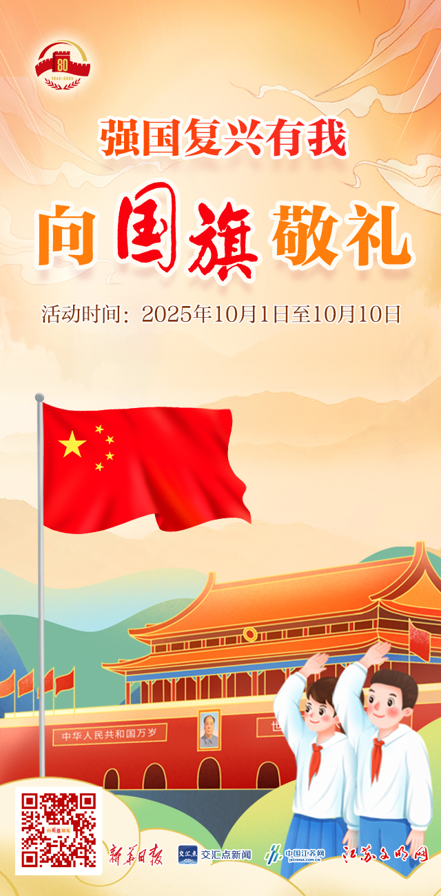 今年是中國(guó)人民抗日戰(zhàn)爭(zhēng)暨世界反法西斯戰(zhàn)爭(zhēng)勝利80周年。為引導(dǎo)廣大青少年弘揚(yáng)偉大抗戰(zhàn)精神、傳承紅色基因,江蘇文明網(wǎng)特別策劃2025年江蘇省青少年“向國(guó)旗敬禮”活動(dòng),歡迎廣大青少年朋友踴躍參與,向鮮艷的五星紅旗敬禮,向偉大的祖國(guó)祝福。