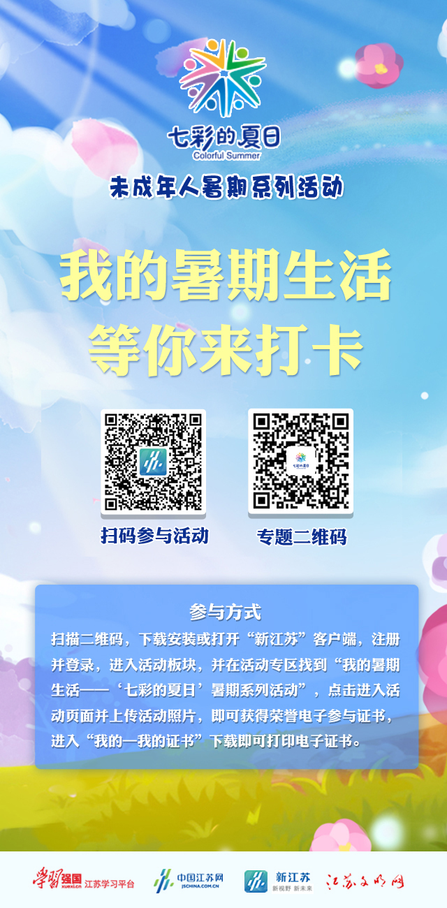為進一步豐富中小學生暑期文化生活,促進文明健康成長,培養學生形成積極健康的心態,江蘇省文明辦、“學習強國”江蘇學習平臺、中國江蘇網·新江蘇客戶端特別策劃推出“我的暑期生活——‘七彩的夏日’未成年人暑期系列活動”!