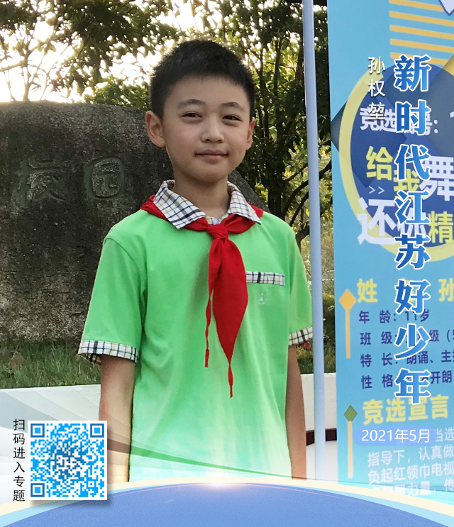 孫權堃,男,2009年5月出生,南京市雨花外國語小學六(5)班學生。孫權堃是校大隊委員,他處處以身作則,為老師分擔事務,為同學們提供服務,多次被評為校“優秀少先隊員”“優秀隊干部”。他熱心公益,充分發揮自己主持、朗誦等特長,積極參與各類環保志愿服務,呼吁大家培養良好的生活習慣和環保意識。2020年,他參與主持《我愛古詩詞——我和長江有個約定》環境日主題活動,通過誦讀古詩詞向社會傳遞環保理念;利用課余時間參加“美麗江蘇小主人,垃圾分類我行動”等垃圾分類公益音視頻拍攝,積極宣傳垃圾分類小知識,倡導廣大青少年樹立垃圾分類意識、踐行垃圾分類行動。他說:“身為南京孩子,很高興能為南京打造美麗古都貢獻自己的力量!”