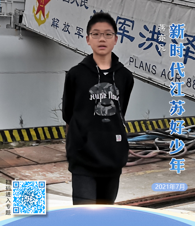 蔣亦凡,男,2008年3月出生,泰州市高港實驗學校七(1)班學生。蔣亦凡喜歡讀紅色書籍、看紅色電影、聽紅色故事,他積極參加“紅色印記”紅色歌曲合唱、“百年黨史 百名師生 百集宣講”系列活動、“學黨史、強信念、跟黨走”主題團日演講比賽、“童心向黨”系列主題教育實踐等活動,被學校評為“最受歡迎的小講解員”。2019年,蔣亦凡在全省鄉村學校少年宮優秀成果展演活動中,向來訪人員詳細介紹了泰州艦138號及中國人民海軍發展歷程,大方的談吐、清晰的解說,受到大家的一致好評。他還利用課余時間在中國人民解放軍海軍誕生紀念館擔任志愿小講解員,目前已義務講解50多場次,講解時長約50多小時,服務游客2000多人次。他希望通過自己的努力,繼續做好家鄉“海軍文化”的宣傳者和踐行者,讓更多人認識泰州、了解泰州、喜歡泰州 。