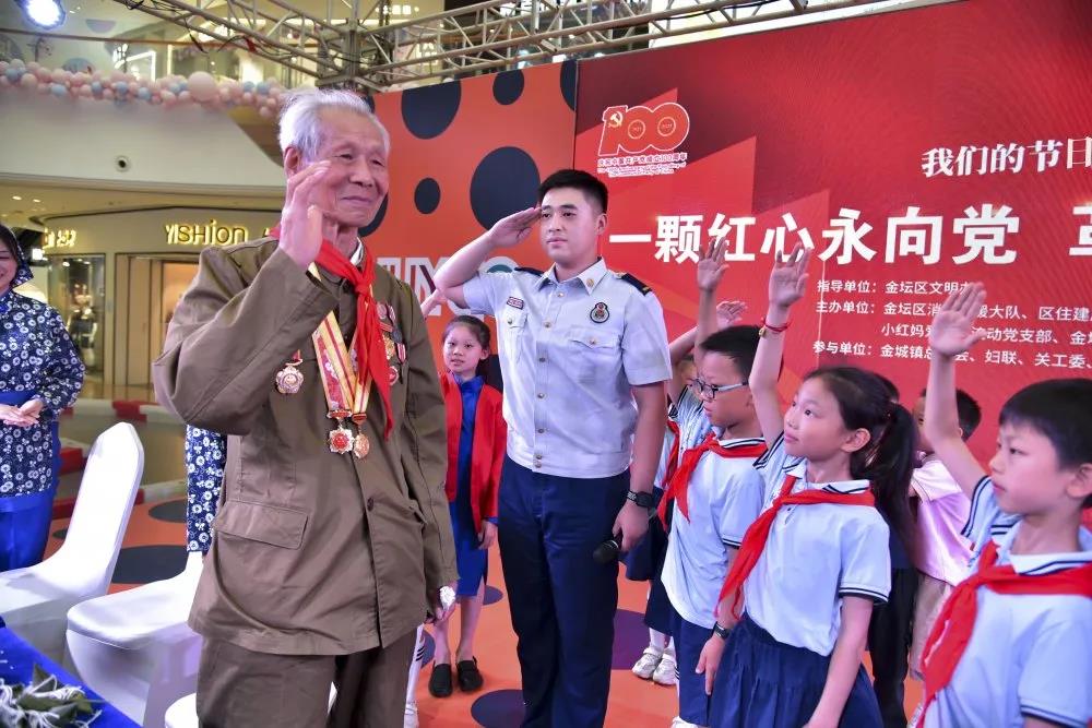 小朋友們為消防指戰員獻上紅心粽和紅媽香囊。少先隊員為老兵佩帶紅領巾;小紅娃吳若塵夾起紅心粽,喂到94歲的抗戰老兵袁友卿嘴邊;消防指戰員為袁老送上節日的禮物。大家紛紛集體向老人敬禮致意,感謝抗戰老兵為國家作出的貢獻。
